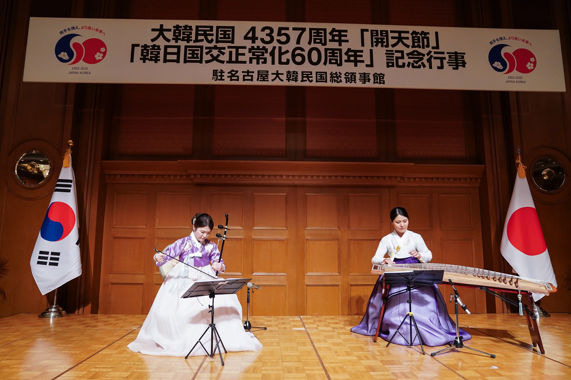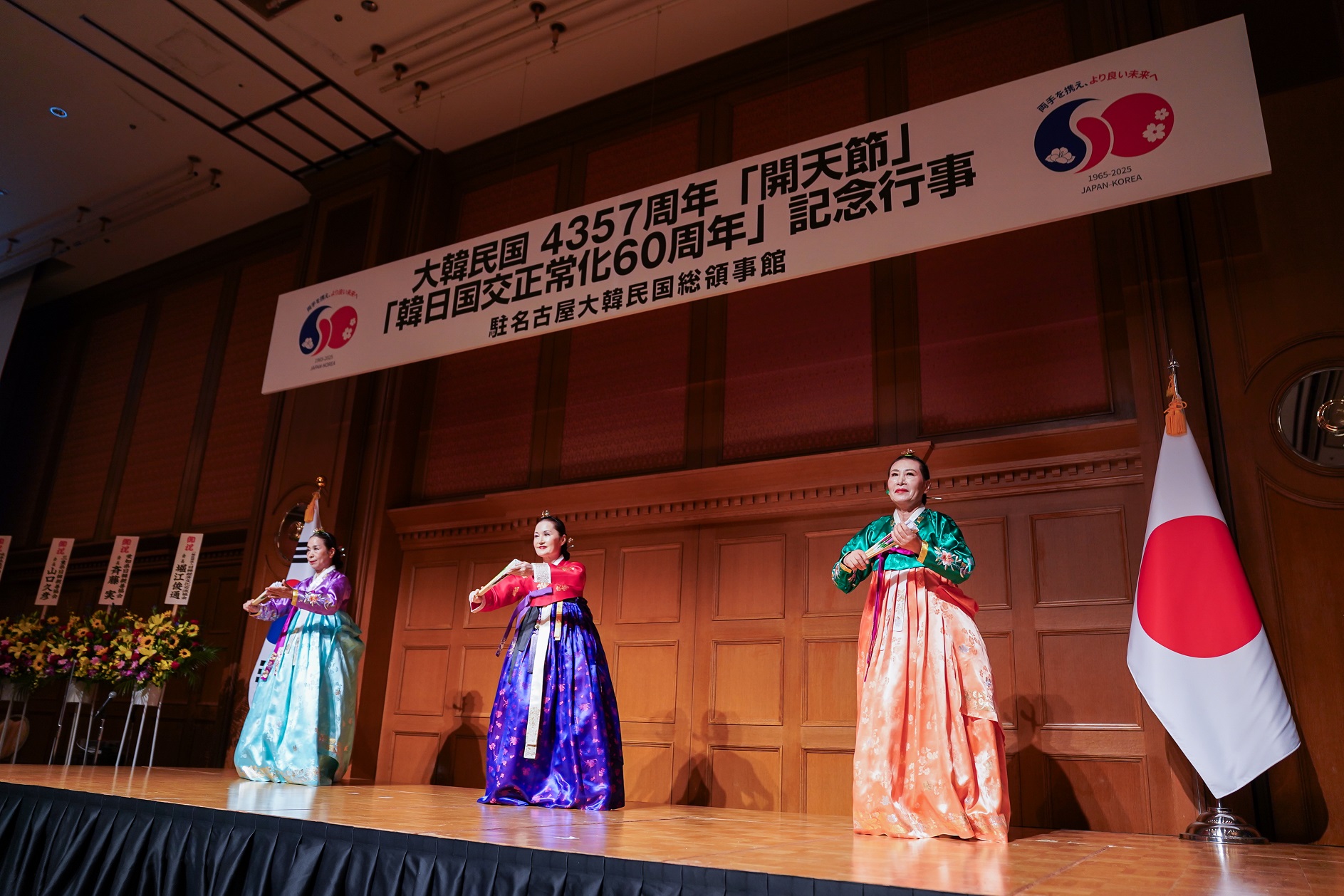 주나고야총영사관은 2025.10.3.(금) 제4357주년 개천절 및 한일국교정상화 60주년을 기념하여, 나고야 관광호텔에서 국경일 리셉션을 개최하였습니다. 이날 행사에는 오오무라 히데아키 아이치현 지사, 히로사와 이치로 나고야시 시장, 이풍굉 재일본대한민국 아이치현지방본부 단장을 비롯한 관할지역 정・관계, 경제계, 언론・문화계, 동포단체 및 외교단 등 각계 주요 인사 약 350명이 참석하였습니다.